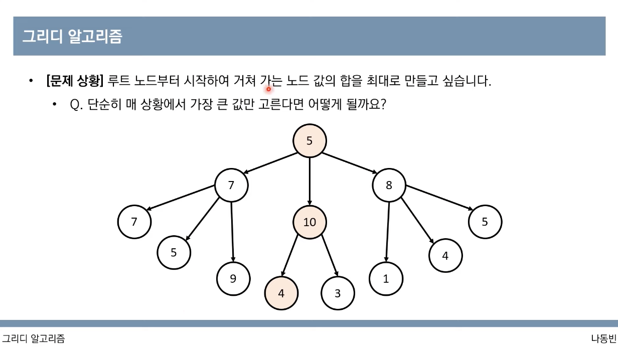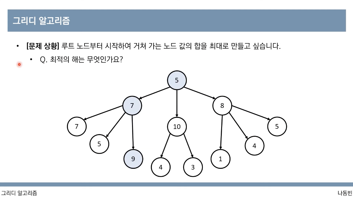 - 단순히 가장 좋아 보이는 것을 반복적으로 선택해도 최적의 해를 구할 수 있는지 검토