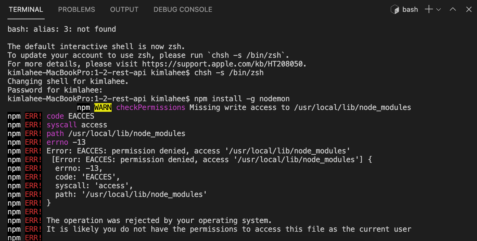 알고보니 node install을 전역으로 해주다보니 나는 권한 오류였다 ,, 흑흑