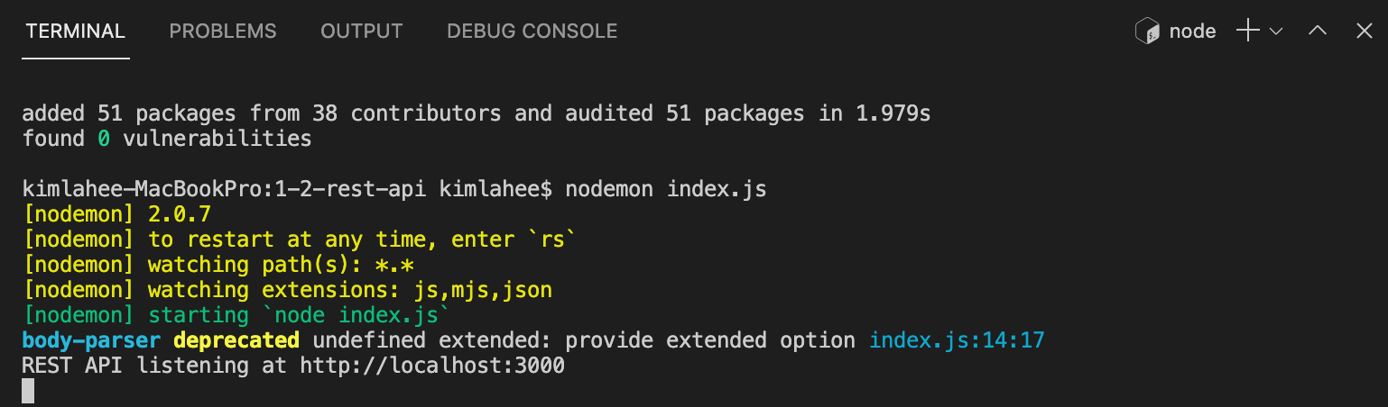 REST API listening at http://localhost:3000 라고 뜨는 걸 확인할 수 있다.