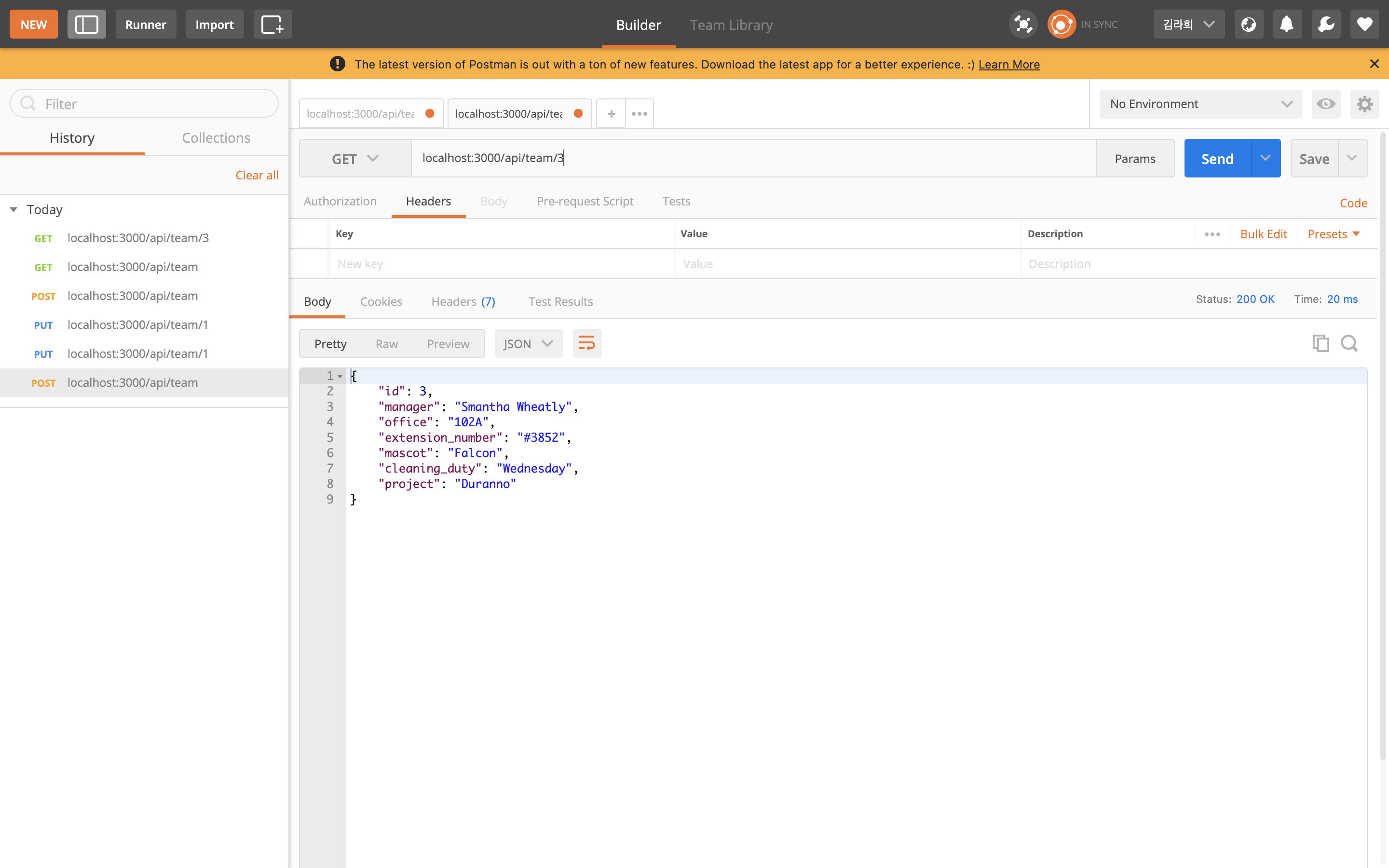- localhost:3000/api/team/4 : 팀 ID가 4 인 곳의 내용을 변경